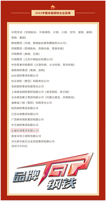 5月10日是全國(guó)第6個(gè)品牌日,中國(guó)冶金報(bào)如期發(fā)布2022年度中國(guó)鋼鐵品牌榜,集團(tuán)公司喜獲兩項(xiàng)榮譽(yù)。其中,集團(tuán)公司獲評(píng)“2022中國(guó)卓越鋼鐵企業(yè)品牌”,錨桿鋼獲評(píng)“2022中國(guó)冶金行業(yè)最具競(jìng)爭(zhēng)力產(chǎn)品”。